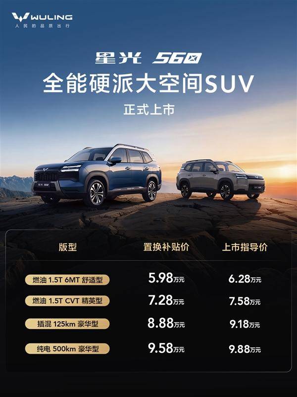 五菱汽车近日正式推出全新车型——星光560,这款定位为“全能硬派大空间SUV”的新车共提供4款配置选择,动力系统覆盖燃油、插电混动和纯电动三种版本,官方指导价区间为6.28万元至9.88万元,置换补贴后价格下探至5.98万元起。作为同级别市场中少有的三动力布局车型,其定价策略直接对标本田飞度等合资两厢车,形成差异化竞争态势。